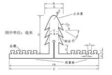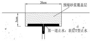 表层 T 型止水条横断面示意图 接缝表层止水示意图 材料特点: 制作 T 型止水的材料需要为有一定强度要求的弹性体材料,一般要求抗拉强度≥12MPa,伸长率≥400%,邵氏硬度 65±5。 T型止水优点: 1)、表层止水是后期专门施工,待防渗面板施工结束再进行表层止水的安装,因此不但避免了施工时的相互干扰,更可提高止水的施工质量。尤其是止水带与面板相互结合的可靠度更高。 2)、止水敷设在坝体表层,工程运行期间利于检查。当止水出现损坏时,较易修补至原样,这是埋入式止水难以做到的。 3)、表层 T 型止水所具有的异构形式,使得该种止水可适应接缝两侧的大变形,其变形适应能力强于埋入式止水。 4)、由于表层止水的施工质量可控性高,因此止水条的宽度相比同等防渗级别的内埋式止水头,可适当降低,从而降低止水的造价。 二、GB系列止水材料 GB系列止水材料包括GB柔性填料、GB复合三元乙丙板、橡胶止水带等,历经20多年的工程实践检验,已在上百项工程成功应用,包括大坝、引水建筑物、工民建等工程的各类接缝止水。尤其适用于高混凝土面板堆石坝的面板接缝止水,具有优异的流动止水性,长期不漏水,被鉴定为具有国际领先水平。 1、橡胶止水带 橡胶止水带是利用橡胶材料在受力时产生高弹变形的特性,经高温模压制成的止水材料。广泛应用于混凝土面板堆石坝、各种堤坝、隧道地铁、人防工事及建筑地下工程的接缝止水。橡胶止水带是在浇筑混凝土时被预埋在变形缝内与混凝土连成一体,可有效地防止接缝处的渗水、漏水,并起到减震缓冲等作用,从而确保各种工程的防水要求。 GB橡胶止水带物理性能(GB18173.2-2014)